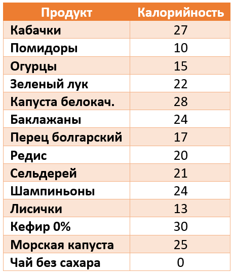 Включать низкокалорийные продукты на 100 г не более 70 ккал