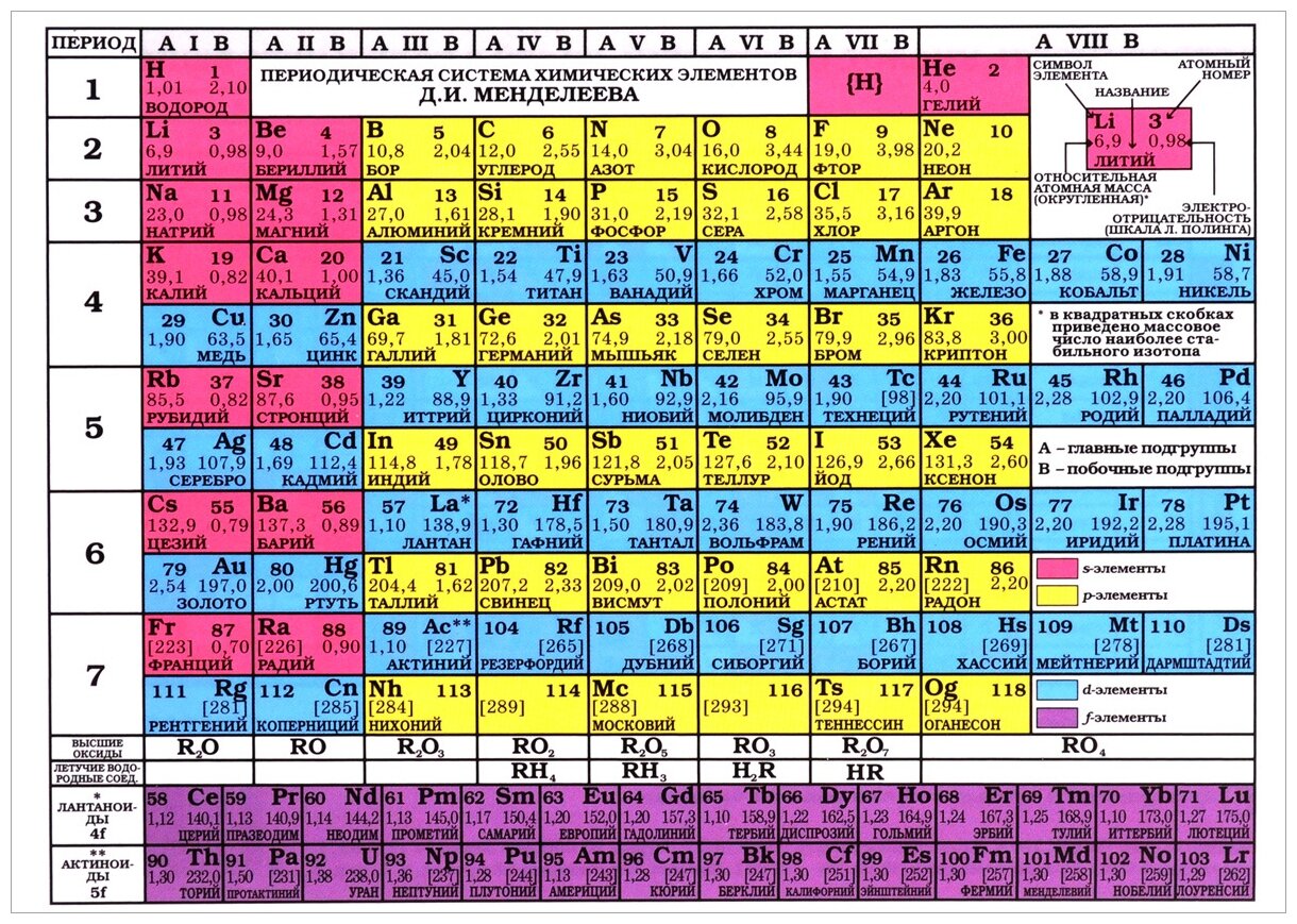 Периодическая система химических элементов – упорядоченное множество химических элементов и их естественная классификация. Является табличным представлением периодического закона, открытого Дмитрием Менделеевым. Современная формулировка этого закона звучит так: свойства элементов находятся в периодической зависимости от заряда их атомных ядер.Прообразом Периодической системы химических элементов служит таблица «Опыт системы элементов, основанной на их атомном весе и химическом сходств», составленная Менделеевым в 1869 году. По мере совершенствования этой таблицы он развил представления о периодах и группах элементов и о месте каждого элемента в системе. В 1871 году в книге «Основы химии» Менделеевым была включена «Естественная система элементов Д. Менделеева» – первая классическая короткая форма Периодической системы химических элементов. Современная Периодическая система химических элементов включает 118 элементов. За последние 50 лет таблица Менделеева пополнилась семнадцатью новыми элементами (102-118). Девять из них были впервые получены в российском Объединенном институте ядерных исследований в Дубне. Последнее добавление в таблицу Менделеева было сделано в 2016 году, она пополнилась четырьмя элементами с 113, 115, 117 и 118 атомными номерами, которые соответственно были названы нихоний (Nh), московий (Mc), теннессин (Ts) и оганесон (Og). Сейчас в крупнейших ядерно-физических центрах мира фактически начаты работы по синтезу 119-го, 120-го и 121-го элементов, которые назвали «большой гонкой».Опубликовано свыше 500 вариантов Периодической системы химических элементов, что связано с попытками поиска решения некоторых частных проблем ее структуры. Наиболее распространены две табличные формы: короткая и длинная (разрабатывалась Дмитрием Менделеевым, усовершенствована в 1905 году Альфредом Вернером). Современная форма Периодической системы химических элементов (в 1989 году Международным союзом теоретической и прикладной химии рекомендована длинная форма таблицы) состоит из семи периодов (горизонтальных последовательностей элементов, расположенных по возрастанию порядкового номера) и 18 групп (вертикальных последовательностей элементов в соответствии с количеством валентных электронов), а короткая форма таблицы – из восьми групп. Номер группы элементов короткого варианта таблицы Менделеева соответствует числу валентных электронов во внешней электронной оболочке атомов. В длинном варианте таблицы номер группы в большей мере формален. Группы короткого варианта включают главную (а) и побочную (б) подгруппы, в каждой из которых содержатся элементы, сходные по химическим свойствам. Элементы некоторых групп имеют собственные тривиальные названия: щелочные металлы (группа 1 длинной формы таблицы), щелочно­земельные металлы (группа 2), халькогены (группа 16), галогены (группа 17), благородные газы (группа 18). В Периодической системе химических элементов для каждого элемента указывается его символ, название, порядковый номер и значение относительной атомной массы.Первый период содержит два элемента – водород и гелий. Второй и третий периоды (литий – неон; натрий – аргон) содержат по восемь элементов. Четвертый (калий – криптон) и пятый (рубидий – ксенон) периоды содержат по 18 элементов. Шестой период (цезий – радон) содержит 32 элемента и