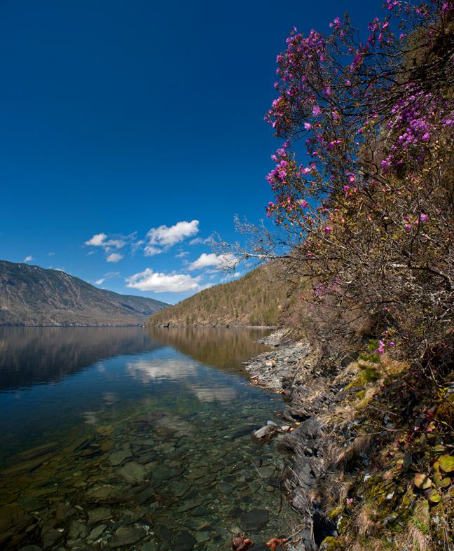 Телецкое озеро, одно из главных туристических направлений Сибири, представляет собой большое озеро, расположенное в узкой долине между заснеженными хребтами Алтынту (запад, вверху) и Корбу (восток, внизу) горных хребтов Алтая. Горы.Озеро имеет длину почти 80 километров, ширину 5 километров и глубину 325 метров; это одно из самых глубоких озер в мире. Но Телецкое озеро — это больше, чем большое глубокое озеро. Он расположен на территории Алтайского заповедника площадью 9 000 км², что помогает защитить его нетронутые воды.