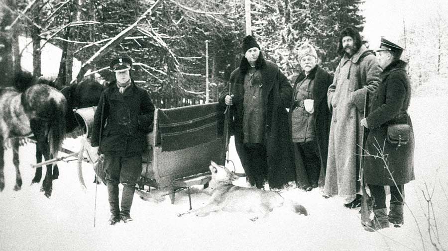 «Александр III на охоте в Беловежской пуще в августе 1894 г.» Худ. М. ЗичиВ 1802 году Александр I своим указом запретил охоту на зубра на территории Пущи. В этом же году Пуща включается в состав Гродненской губернии, гербом которой был зубр. С 1809 года начинается регулярный учёт зубров, в 1864 году из Германии завозятся олени (они были полностью уничтожены к 1705 году) для дальнейшего их разведения и организации на них охот[18]. В 1888 году Пуща была включена в собственность царской семьи в обмен на земли в Орловской и Симбирской губерниях. В 1889—1894 годах был построен императорский охотничий Дворец в Беловеже, к которому была проложена железная дорога для более удобного подъезда царских особ. С этого времени организовываются пышные охоты, наиболее грандиозные из которых датируются 1897, 1900, 1903 и 1912 годами[19].