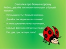 Некоторые ошибочно считают, что, сколько точечек на божьей коровке, столько ей и лет. Это неверно. Точки говорят не о возрасте, а о том, к какому виду принадлежит коровка: две точки—двуточечная, пять точек – … (пятиточеченая), семь точек – … (семитотечная). А сейчас, внимание – игра! (Дети делятся на три команды – дву-, пяти- и семиточечные божьи коровки, каждая команда должна найти в групповой комнате изображение своей божьей коровки и встать вокруг нее в круг. Побеждает та команда, которая сделает это быстрее).