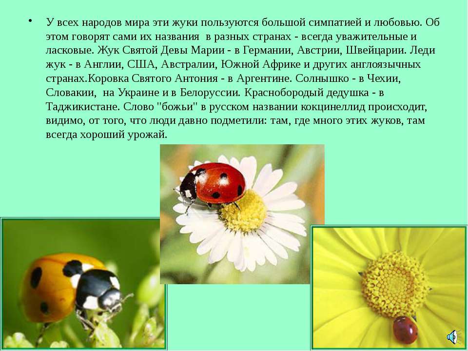 Среди огромного разнообразия больших и маленьких жуков, что деловито снуют по лесам, полям, садам и огородам, особой симпатией у людей пользуются божьи коровки. Эти маленькие яркие жучки помогают человеку спасать урожай от различных вредителей. За это маленькие помощники человека и получили такое ласковое название. В нашей стране их называют «божья коровка», в некоторых странах Восточной Европы этих жучков ласково величают «солнышко», а в Западной Европе они именуются, как «жучок девы Марии».