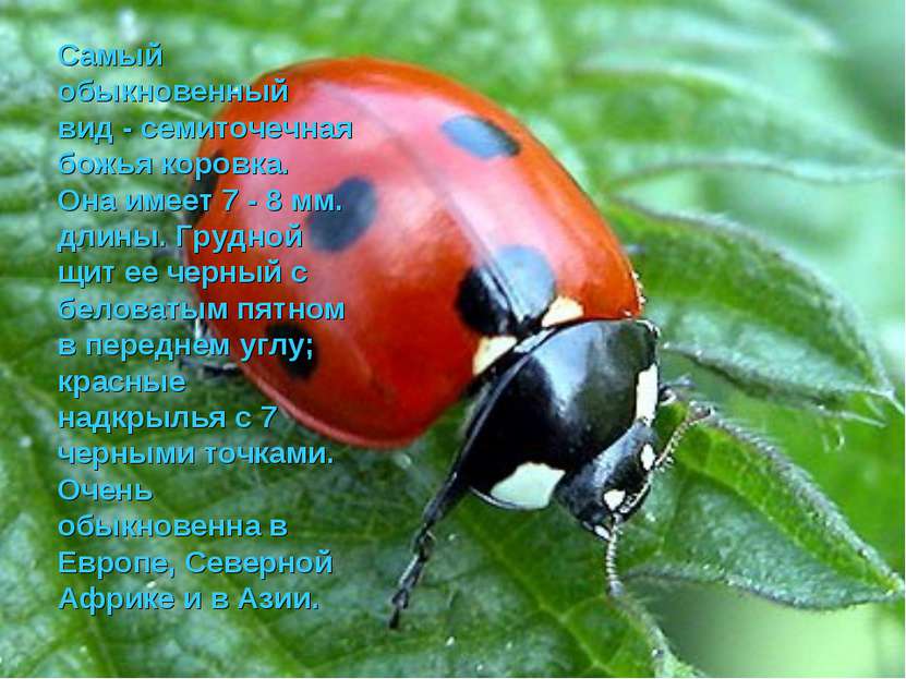 Помимо яркого цвета и пятен, божьи коровки при испуге или угрозе выделяют жидкость с неприятным запахом, которая токсична для мелких млекопитающих и птиц. - Среда обитания божьих коровок — леса, луга, реки, но также и пригороды. Семиточечные божьи коровки изначально были местными только для европейского субконтинента, однако в 1900 году эти жуки были завезены в Северную Америку, чтобы бороться с неприятной проблемой тлей, которая уничтожала посевы.