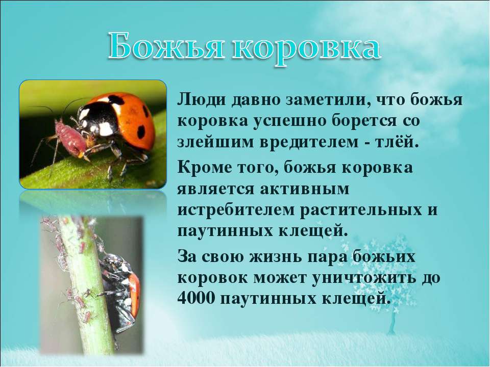 Так что божьи коровки приносят исключительно пользу. Но дабы они спокойно проживали у вас в саду и на огороде, надлежит полностью исключить применение химических средств при опылении и опрыскивании садово-огородных насаждений.