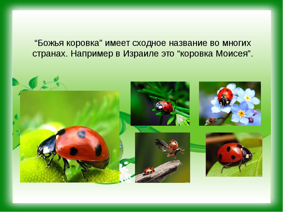 Свое столь необычное название божья коровка получила благодаря своему ярко-красному окрасу, вызвавшему симпатию людей. Так, например, в Словении и Чехии ее назвали «солнышком» (Slunechko), в Германии и Швейцарии она известна как «жучок Девы Марии», в странах латинской Америки ее называют «коровкой святого Антония». Что же происхождения название «божья коровка», то есть две версии на этот счет, согласно первой, «коровкой» ее назвали за способность выделать ядовитое молочко, которое отпугивает потенциальных хищников, приставку «божья» наша коровка получила за свой кроткий и мирный нрав. По другой версией «божьими» эти насекомые стали благодаря их способности уничтожать тлю, чем способствовать сохранению урожая.