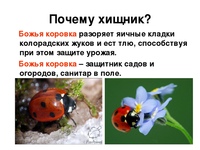 🐞 Этот мелкий хищник, зовущийся «божьей коровкой» и не очень съедобный для большинства насекомоядных, весьма полезен. Ибо в его рацион с весны и до первых заморозков входят самые разноплановые вредители растений, приносящие огромный вред садово-огородному хозяйству. Причем жучок, войдя во взрослый возраст, весьма прожорлив.