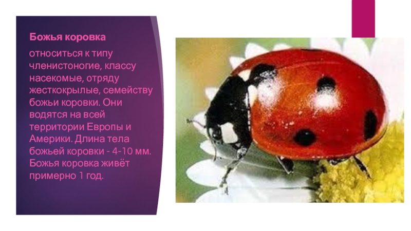 По биологической классификации божья коровка – членистоногое насекомое, которое относится к жесткокрылых и семейству божьих коровок.