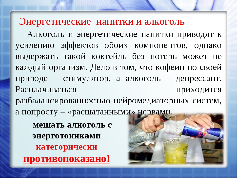 Во многие сладкие газированные напитки добавляют кофеин – искусственный энергетик. При систематическом употреблении кофеин приводит к истощению нервной системы, слабости, перепадам настроения и даже к депрессии. Также кофеин оказывает раздражающее действие на слизистую желудка и кишечника, выводит кальций из костей и зубов, повышает артериальное давление, вызывает зависимость.