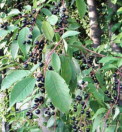Связанные| Кора — у первый гладкий, красновато-коричневого цвета, с хорошо заметным длинным белым дыханием поры; с возрастом становится очень шероховатым из-за неправильных, близких, темных чешуйчатых круглых пластин с перевернутыми краями. Веточки — тонкий, гладкий, красновато-коричневого цвета, с горьким миндальным вкусом, характерен для всех вишен. Зимние бутоны — гладкие, яйцевидной формы, длиной от 1/8 до 1/6 дюйма, заостренной, каштаново-коричневого цвета; присутствует терминальный бутон. Листья — альтернативные, простые, длиной от 2 до 5 дюймов, ланцетные, шире, чем у черешни, довольно заостренный, края мелкопильчатые, пучки волос вдоль средней жилки на нижней поверхности листа. Фрукты — а односемянные сочные плоды диаметром около 1/2 дюйма, сгруппированные на очень коротких стеблях, в длинные разбросанные, поникшие грозди, пурпурно-черные при созревании в конце лета. Птицы и животные едят этот фрукт, хотя его вкус явно горький. Отличительные особенности — длинных белых пор на молодой коре; темные чешуйчатые, круглые, блюдцеобразные пластины у старых лаять; опушенная средняя жилка внизу на листе; плоды в гроздьях с короткими стеблями. [вернуться на главную] |