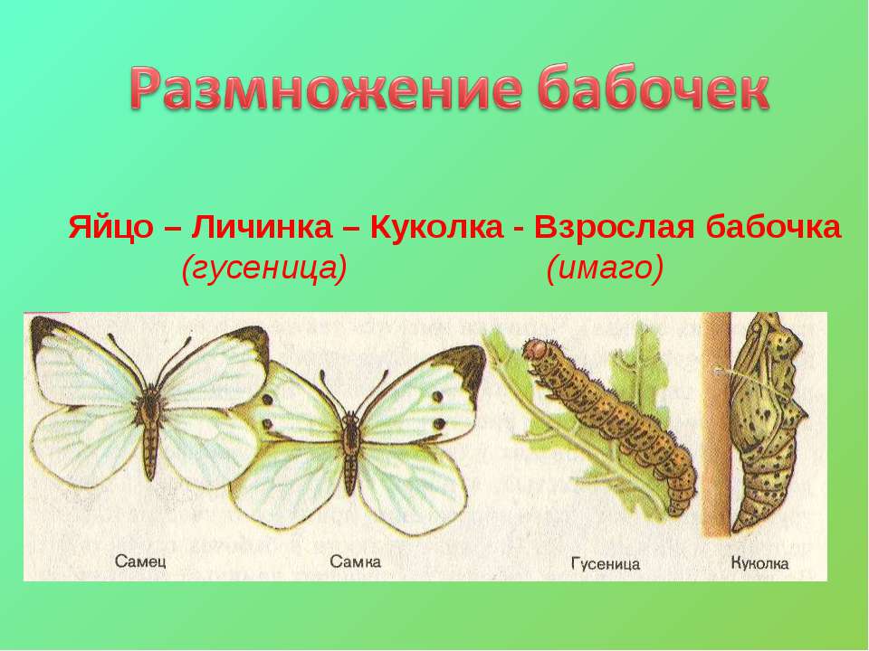 - Развитие с полным превращением. Взрослая особь спаривается и откладывает яйца на «кормовом» растении. Вылупившиеся гусеницы поедают растение. Полностью выросшая гусеница превращается в куколку, покрываясь твёрдой оболочкой, в которой происходит формирование бабочки-имаго.