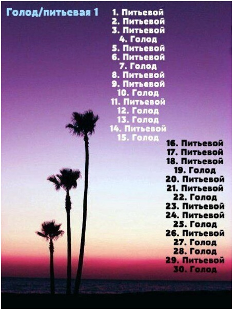 Очищенная простая вода без газа. На протяжении всего дня необходимо выпивать полтора литра воды, примерно по стакану. Не пейте сырую воду из-под крана. Еще раз напоминаем, что в напитки питьевой диеты категорически запрещено добавлять сахар и всяческие его заменители! Также полностью исключите из рациона алкоголь, «газировку», магазинные соки в пакетах, кисломолочные продукты с высоким процентом жирности (от 2%). Обязательным условием питьевой диеты является ежедневное употребление в пищу супов-пюре. Чередование продуктов питания при питьевой диете.