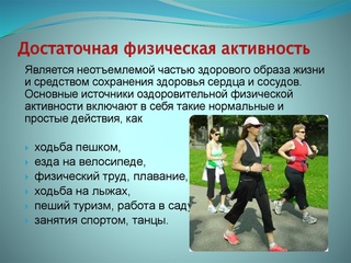 - еженедельные упражнения средней и высокой интенсивности не менее 150 минут, согласно американскому сердцу Ассоциация