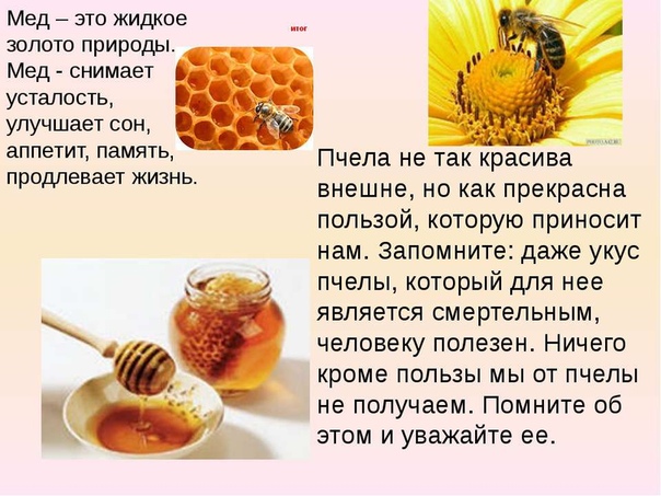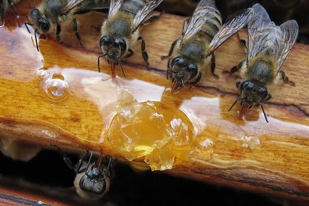 Медоносные пчелы собирают, кроме корма, воду для охлаждения внутри гнезда в жаркие дни. Они также используют воду для разбавления меда, когда скармливают его личинкам. Иногда мед пчелы собирают липкую смолу и камедь деревьев и превращаются в вещество под названием . прополис . Они использовали прополис, чтобы заткнуть нежелательные отверстия в улье, чтобы мыши и вредители, такие как воск моль или муравей не могут попасть внутрь.Пчелы также нанесли тонкий слой прополиса на интерьер. улья для защиты от болезней. При работе в улье пчеловод использует инструмент для ульев, чтобы разобрать рамки, которые могут склеиться прополисом.