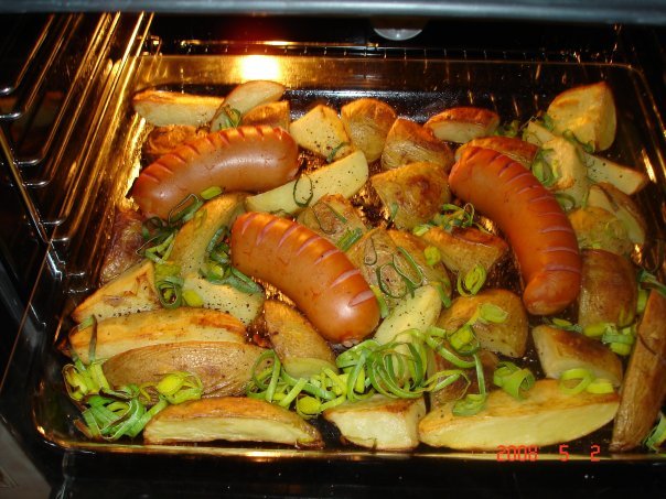 Приготовление: Помой, почисти, нарежь крупными кусками все овощи и разложи их по краю формы для запекания. Выпотроши рыбу, при желании – отрежь голову и нарежь тушку, выложи между овощами. Сбрызни все маслом, посоли, добавь специй и выпекай 45 минут при 180 градусах.