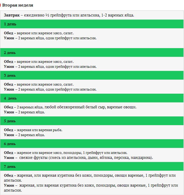 Меню на каждый день предполагает одинаковый завтрак: 1 грейпфрут, 2 вареных яйца, чашка кофе без сахара. А вот обед и ужин различаются: