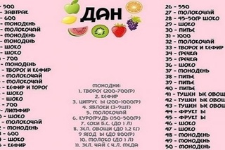 | Понедельник | Нежирные молочные продукты: молоко, ряженка, йогурт, кефир |