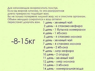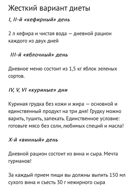 Есть еще одна популярная схема, которая предлагает вам насытить организм белком, а затем урезать рацион до минимума. Автор – женщина-диетолог из города Таллина. Она опробовала свой метод на добровольцах, которые посещали ее салон красоты. Все они пришли к выводу, что, несмотря на некоторые сложности, связанные со строгими ограничениями рациона, это очень хорошая диета «6 кг за 6 дней».