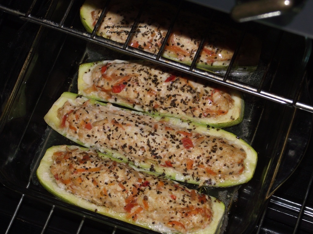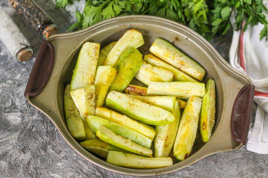 - Выкладываем кабачковые чашечки в жаропрочную форму и запекаем их в духовке 10 минут при 180 градусах.