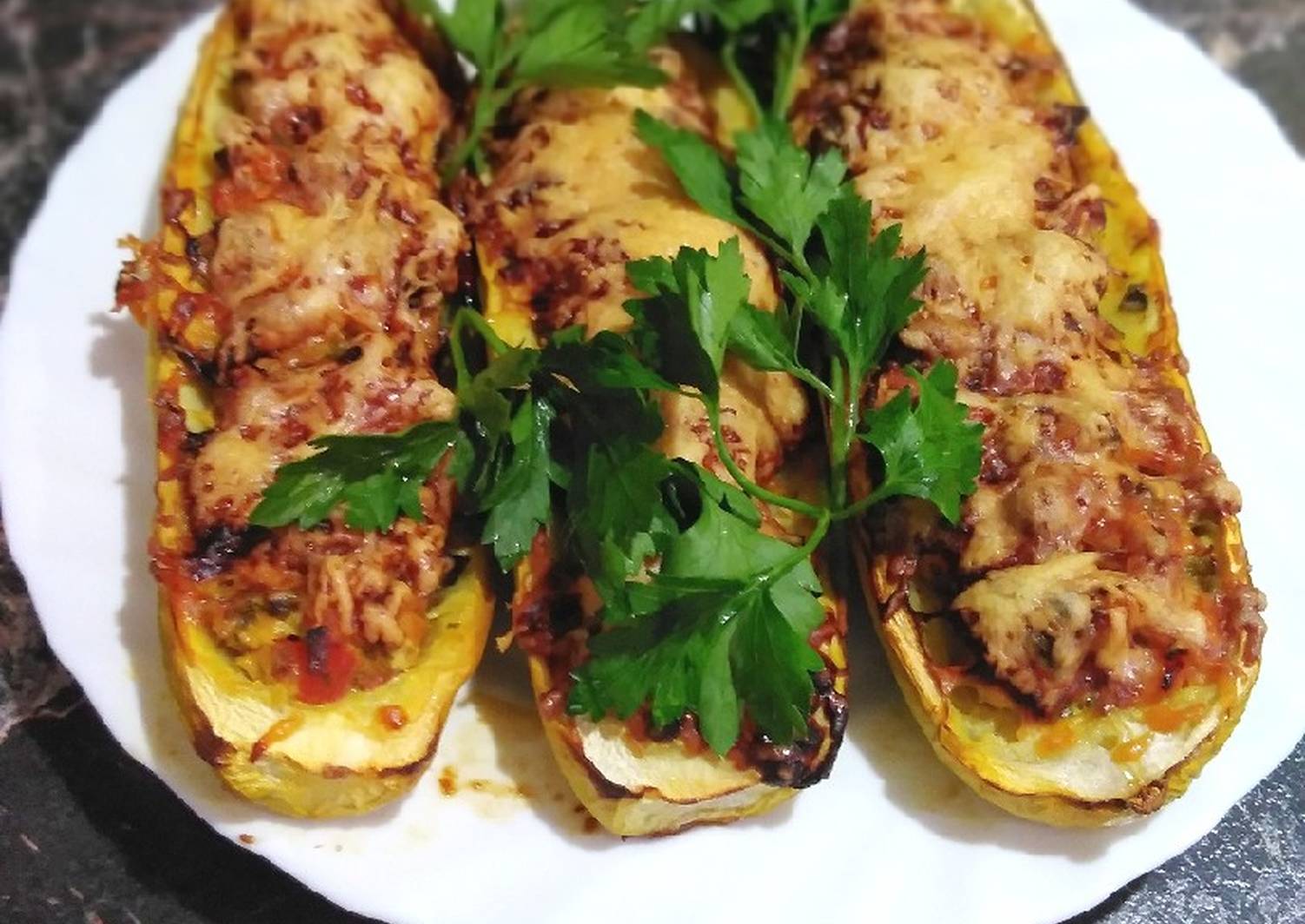 Спагетти-сквош, фаршированные энчиладой с курицей