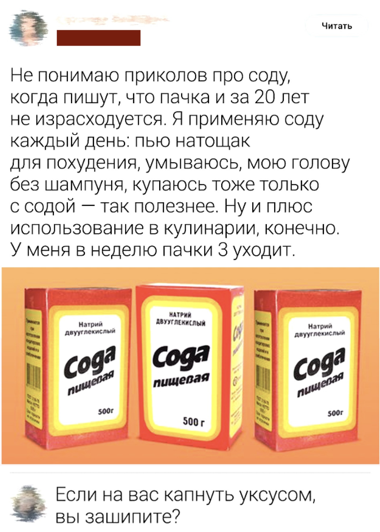 В карантин рецепты наших бабушек получили вторую жизнь — потянуло нас ко всему натуральному и домашнему. Сначала на них перешли звезды и ЗОЖ-блогеры, следом похватили все. В итоге уже больше двух месяцев в гугле растет рейтинг запросов на «осветление волос соком лимона» (читайте здесь опыт Ланы Дель Рей), «ополаскивание волос уксусом» (протестировала наш бьюти-директор по ссылке) и «маски в домашних условиях». А недавно на новый виток популярности вышли рецепты со старой-доброй содой: инфлюенсеры клянутся ей в вечной верности и уверяют в волшебных свойствах, если принимать внутрь каждый день. А еще, мол, сода улучшает состояние кожи, если делать из нее маски, и помогает похудеть, если принимать с нею ванны.