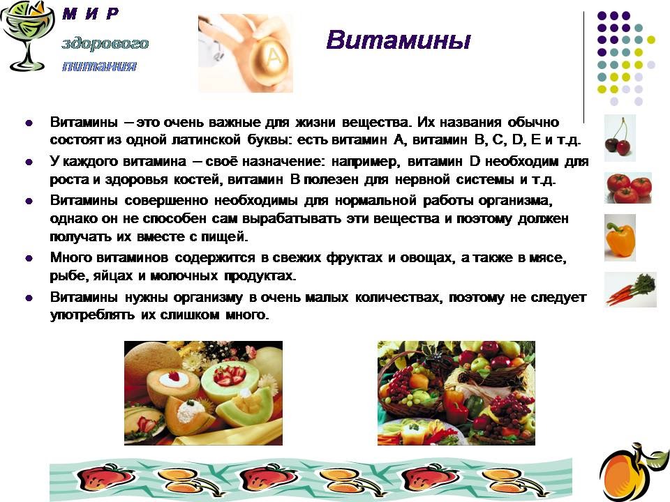 С пищей организм получает жизненно важные белки, жиры, углеводы, а также биологически активные вещества — витамины и минералы, соль.