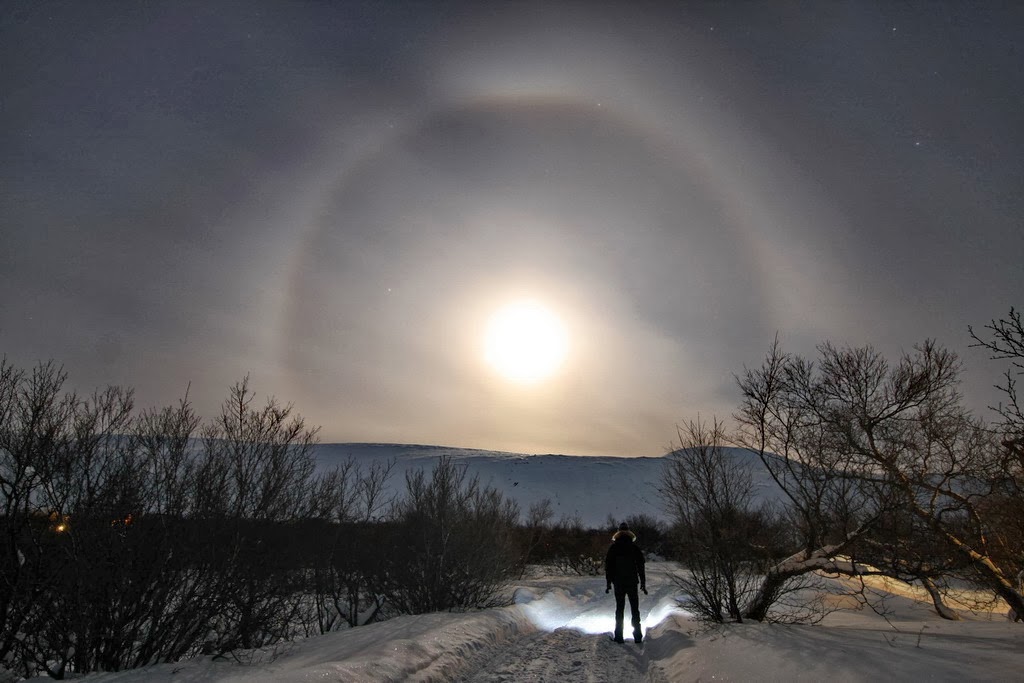 Самый простой ответ — «радуга» вокруг солнца. Радуга, которая создается не капельками воды (как обычная радуга), а радуга, которая создается ледяными кристалликами. Наблюдать гало на небе можно в любое время года, ночью и днем, вокруг солнца или луны и даже вокруг фонарей или ламп (последнее возможно только в холодную погоду).