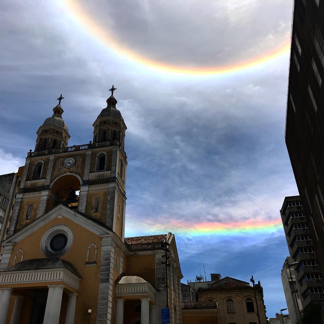 - радужные гало, полноцветные: видны также синий и зеленый цвета: касательные дуги 46° гало, окологоризонтная дуга.