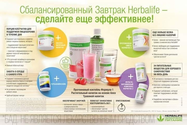 Чтобы ещё больше увеличить свой результат, улучшить общее самочувствие и разогнать обмен веществ, вы можете добавить в свой рацион другие продукты Herbalife. Например, кроме ужина, можно заменить утренний приём пищи сбалансированным завтраком от Herbalife, который кроме протеинового коктейля Формула 1, включает в себя Растительный Напиток Алоэ, стимулирующий процесс пищеварения, а также Травяной Напиток, тонизирующий организм и усиливающий антиоксидантную защиту.