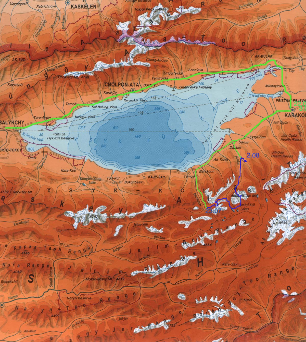 Длина Иссык-Куля составляет 178 километров, ширина — 60 километров, отметка уровня 1607 м.