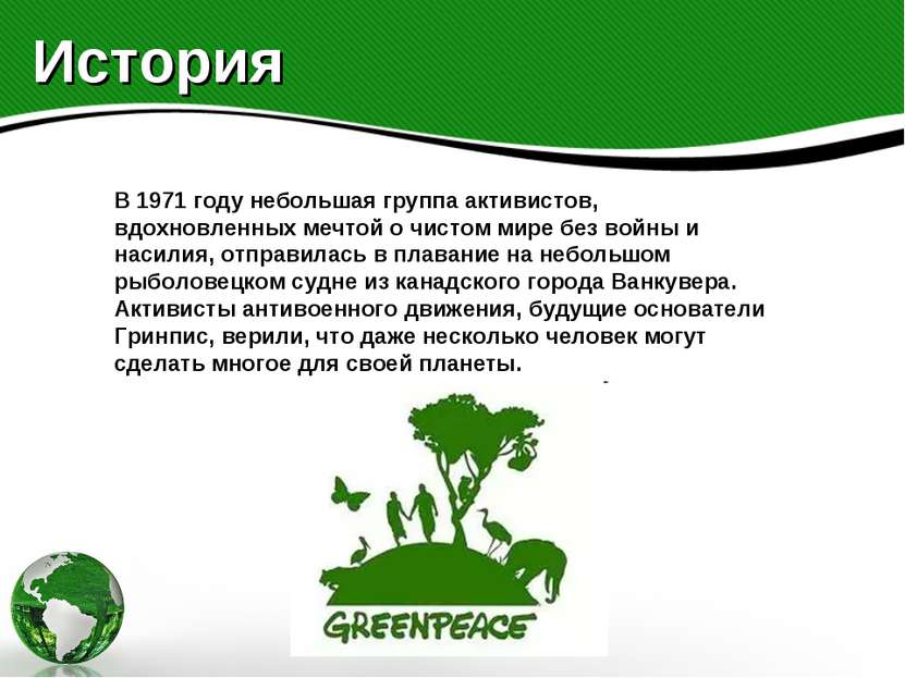Международная организация «Гринпис» (англ. Greenpeace, «Зеленый мир») была создана в 1971 году. Есть версия, что ее учреждение связано с прошедшей в сентябре того года экологической акцией, направленной против испытания ядерного оружия. Группа энтузиастов, возглавляемая предпринимателем Дэвидом Таггартом, организовала акцию протеста против правительства США. С течением лет организация «Гринпис» выросла из небольшой группы экологов до одного из самых влиятельных объединений мира.