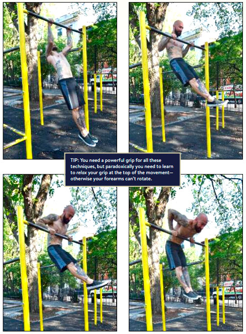 Мы часто видим, как люди просто машут ногами, но при этом когда они их опускают, то полностью теряют заряд энергии вместо того, чтобы передавать его по кинетической мышечной цепочке от ног к рукам. - Попытки выходов без проворота кисти. Ещё одна очень распространенная ошибка, особенно среди тех атлетов, чей уровень подготовки уже позволяет делать высокие подтягивания. Не зная техники выходов силой они просто пытаются как можно выше подтянуться, но при этом не могут перевести себя из положения виса в положение упора, потому что их кисти остаются под перекладиной.