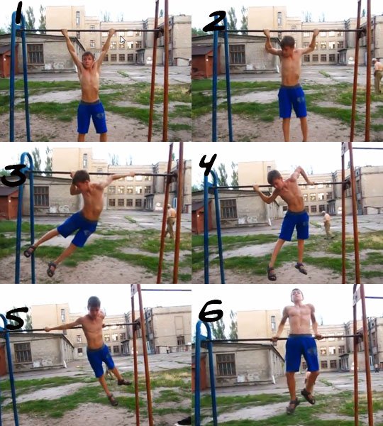 Подтягивания до груди (или выше). Умение высоко подтягиваться является краеугольным в процессе изучения выхода, потому что если вы не сможете достаточно высоко подтянуться, то у вас просто не получится провернуть кисть и поставить запястье над перекладиной, чтобы выжать себя вверх. Сначала можете научиться подтягиваться до груди, потом до живота. Если силы в ваших мышцах пока недостаточно, то вы можете использовать свои ноги. Даже небольшая раскачка (киппинг) или мах ногами позволит значительно облегчить это упражнение.
