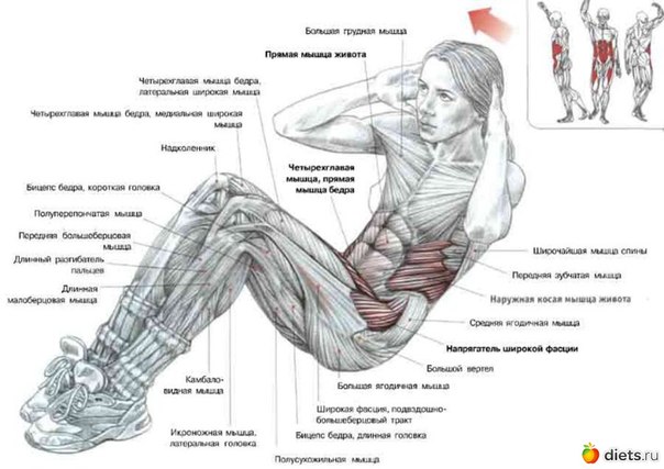 При этом ноги можно немного согнуть в коленях, а руки заложить за голову. Пытайтесь коснуться локтями колен, а откидываясь назад, делайте это не полностью. Возможно, вам понадобиться небольшая подушка под копчик, иначе он может причинять некий дискомфорт. Это упражнение развивает верхние мышцы пресса.