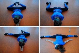 - Третье упражнение выполняется из положения сидя. Прямые ноги необходимо развести, носки при этом смотрят вверх. Далее выполняются наклоны вперед. Цель – достать до пола верхней частью корпуса.