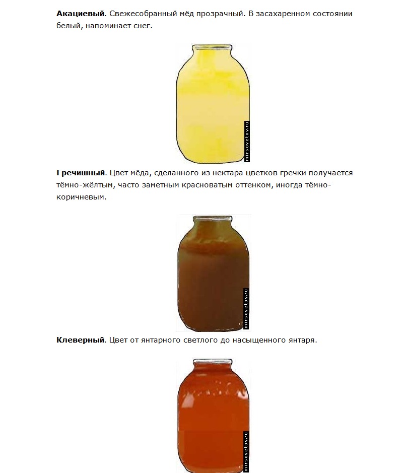 - как отличить натуральный мед от искусственного по цвету: цветочный мед имеет светлые оттенки, липовый – янтарного цвета, а гречишный – коричневый.