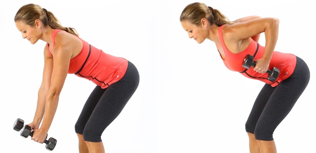 Попеременная тяга гантелей – Держите гантели ладонями от тела, ноги на ширине плеч. Согните колени и бедра и опустите верхнюю часть тела, пока она не станет почти параллельной полу. Удерживая пресс в напряжении, согните левый локоть и подтяните вес к туловищу. Медленно опустите левую руку, согнув правый локоть, и выполните тягу в другую сторону. Всего повторите от 10 до 15 повторений.