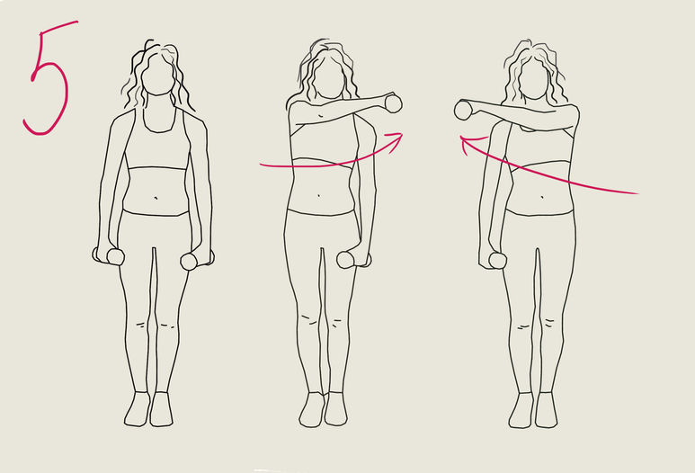 - Встаньте, ноги вместе, возьмите гантели в каждую руку, отведите плечи назад.