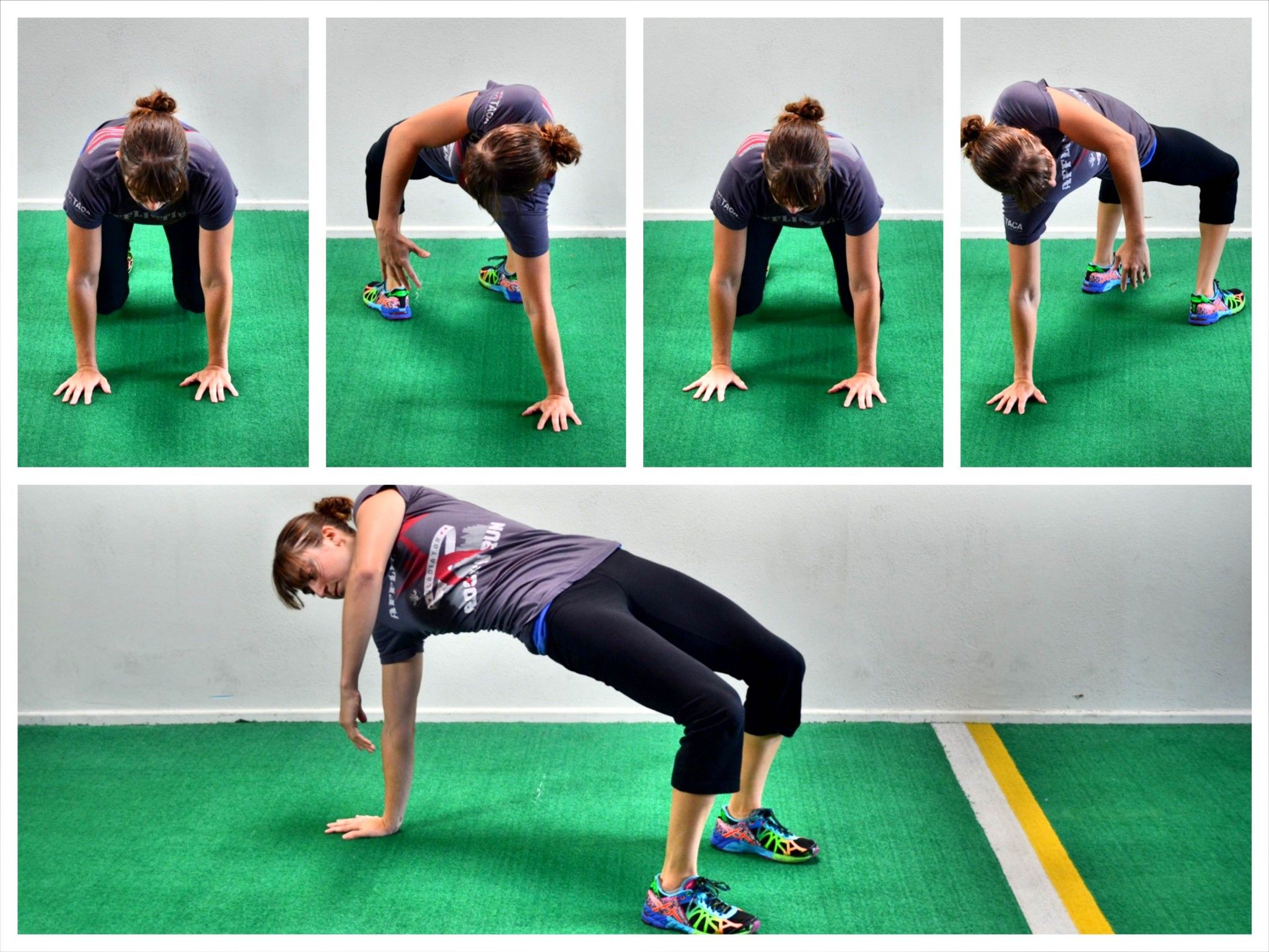 - Упор на руку и стопы, ягодицы отрываются от поверхности, после чего вторая рука описывает дугу и опускается на пол.