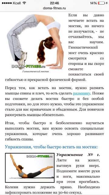 Итак, чтобы быстро и безболезненно научиться выполнять мостик, вам нужно освоить специальные упражнения, которые очень хорошо развивают гибкость спины.