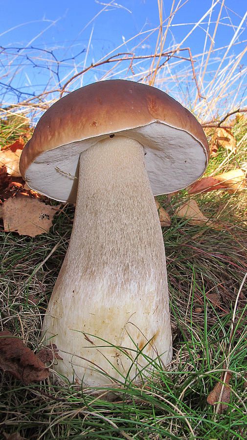Белый гриб (описание). Трубчатый гриб, ножка которого может достигать 25 см в высоту (в среднем 12 см), толщиной около 10 см. Имеет форму, напоминающую бочонок. В процессе роста может приобретать цилиндрическую (расширенную или суженную) форму, в основании всегда остающуюся немного утолщенной. Поверхность на ножке белая, иногда имеющая коричневатый или красноватый оттенок. Ножка покрыта сеточкой белых прожилок, локализованная больше в верхней части.