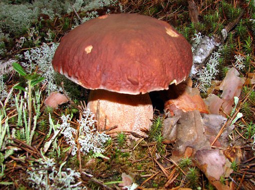 Тот самый боровик. Окрас кроны варьируется от белого, темно-красного до желтого и коричневого. Сама она достигает 30 см, редко – 50 см. Нижняя часть дорастает до 16 см.