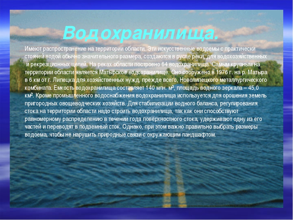 Их суммарный полный объем превышает 1 200 км 3, площадь зеркала составляет 87 тыс. км 2 (т;е, больше территории Австрии), а с учетом подпруженных озер – 145 тыс. км 2. На водохранилища России приходится около 15 % их общего количества в мире и 20 % объема площади. Длина береговой линии водохранилищ превышает длину береговой линии морей, омывающих нашу страну. На берегах водохранилищ проживает 20 млн. человек.