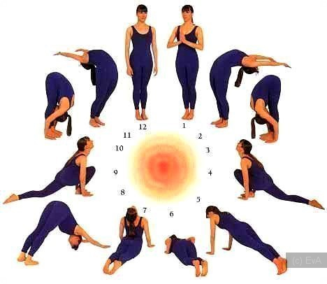 Начните с позы приветствия солнцу, а затем продолжайте с нескольких, таких как собака лицом вниз, триконасана, поза лодки и т. Д.