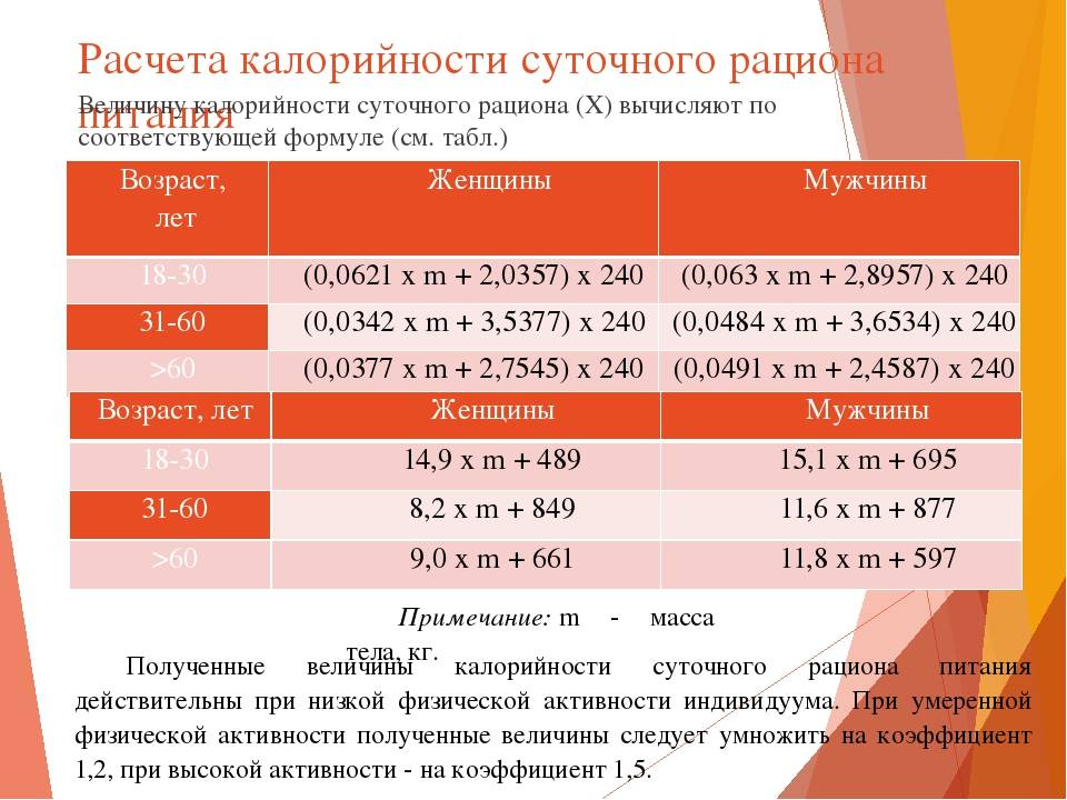 Исходя из значения соответствующего коэффициента и выводится количество необходимых калорий в день, путем умножения одной величины на другую.