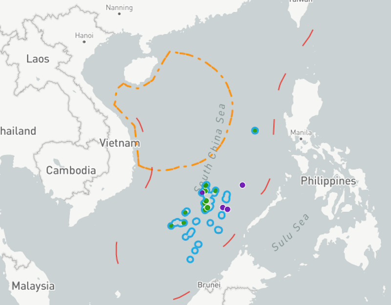 Китай развернул масштабные землечерпательные работы по искусственному наращиванию надводной части некоторых островов в районе спорного архипелага Спратли. На его отдельные части претендуют, помимо КНР, Филиппины, Вьетнам, Малайзия, Тайвань и Бруней. Регион имеет важное стратегическое значение и богат залежами углеводородов. Синий пунктир на карте отмечает область, которую Китай считает своей.