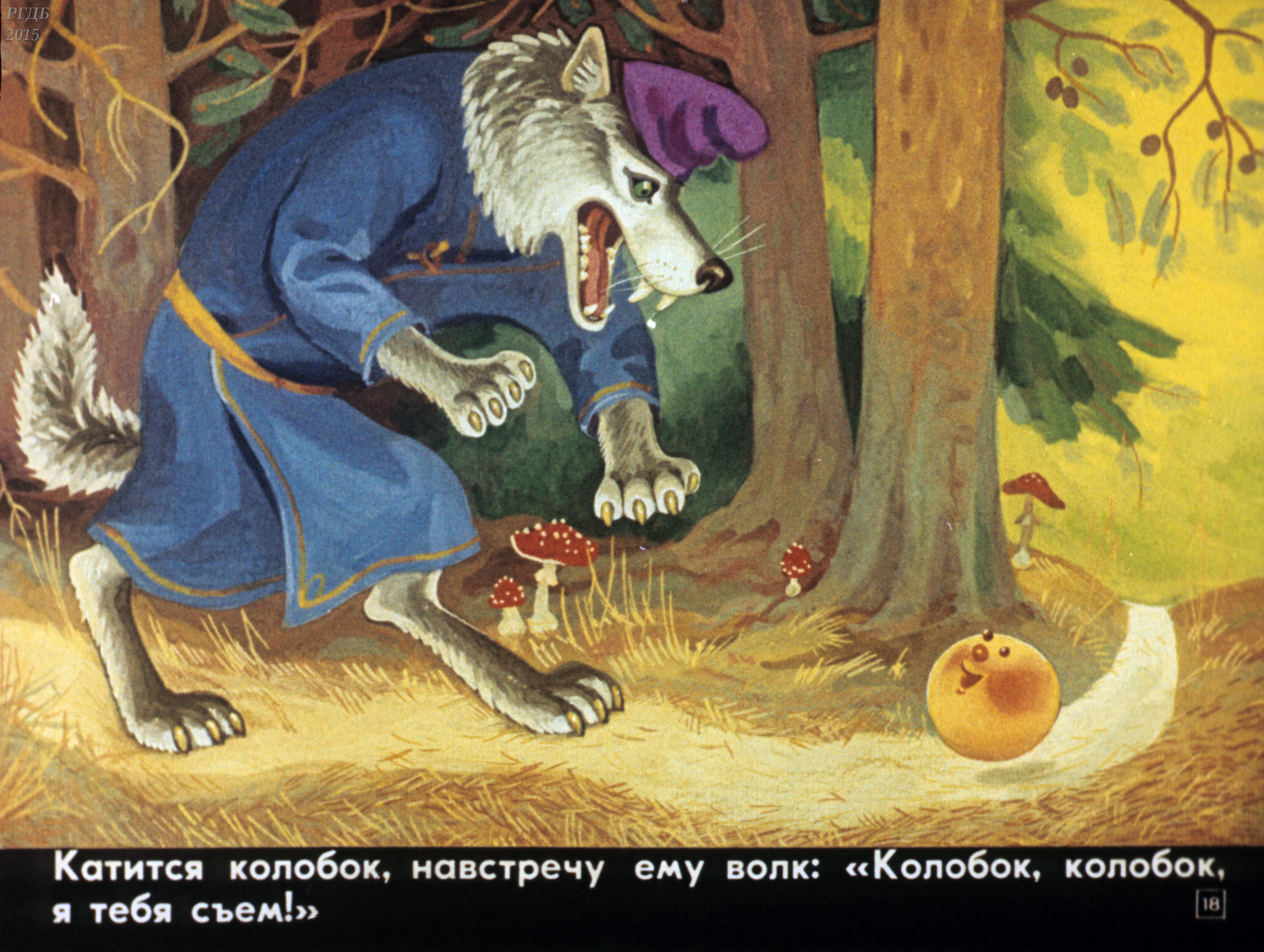 А навстречу Волк. Тоже на Колобок пасть разевает. А Колобок и Волку свою песню поет, да в конце добавляет, что и от Волка уйти не хитро.