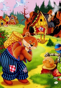 Укатился Колобок от Волка, дальше катится. Медведь навстречу, тот еще сластена. Тоже мечтает Колобок откушать. Но и ему Колобок свою песню спел и укатился.