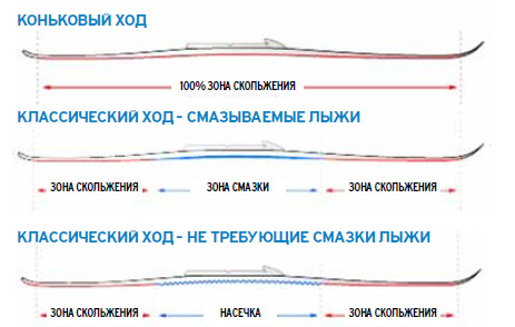 В классических лыжах лыжи проходят параллельными дорожками. На базе классических лыж, которыми лыжник прижимается к снегу, есть липкая зона.