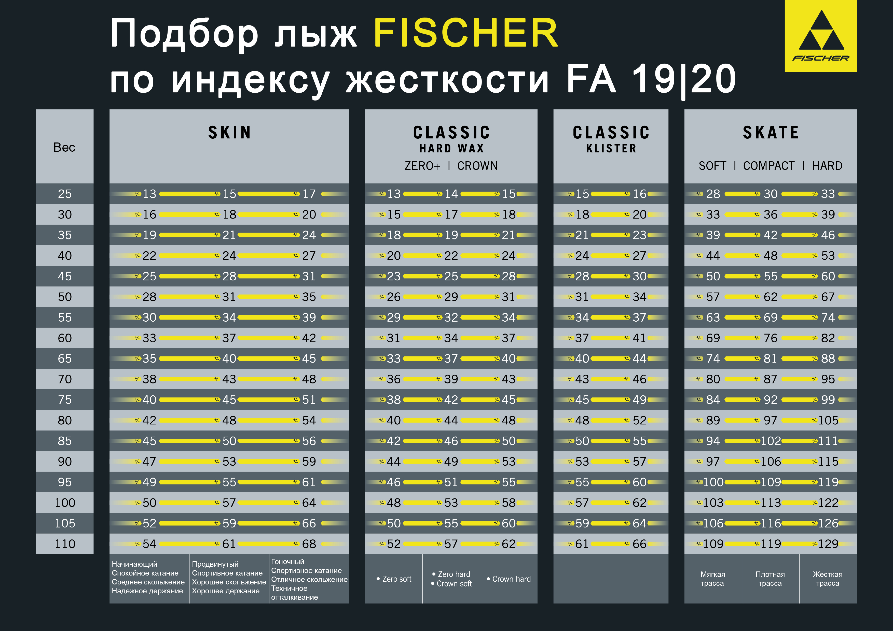 - Лыжи отличаются конструкциями, типом пластика и структурами, подбираются по жесткости через индекс FA. Подробнее о всех обозначениях на лыжах Fischer читайте в отдельной статье: Все о цифрах на лыжах Fischer.