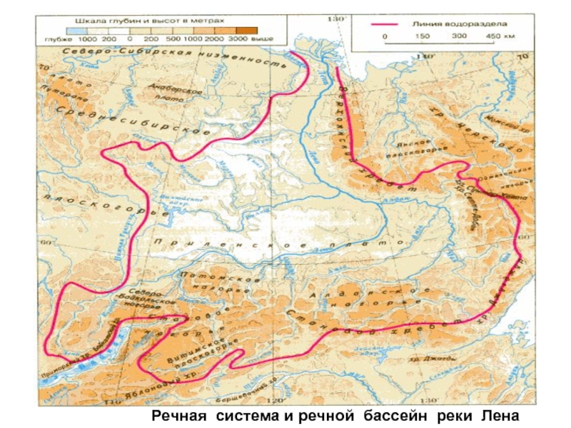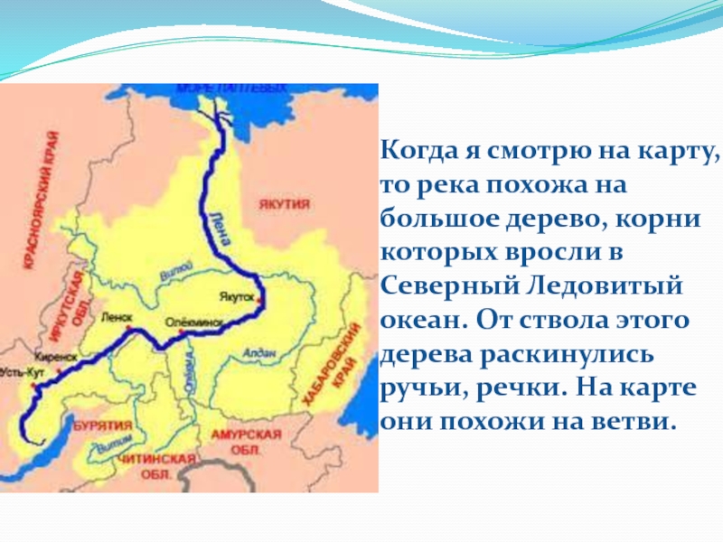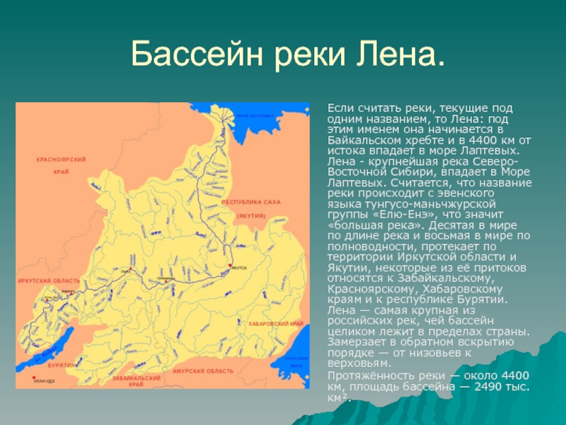 Лена – река, протекающая в Восточной Сибири, одна из величайших рек мира. Длина её составляет 4400 км, площадь бассейна 490 тысяч км2. Протекает по Иркутской области и Республики Якутия. Берёт начало на западном склоне Байкальского хребта, на высоте 930 м. Впадает в море Лаптевых. Большая часть бассейна располагается в области распространения многолетнемёрзлых горных пород и грунтов и покрыта тайгой. Верховья Лены и значительная часть бассейнов её правых притоков находятся в горных районах Прибайкалья, Забайкалья, на Алданском нагорье. Основная часть левобережного бассейна расположена на Среднесибирском плоскогорье. Наиболее пониженный участок бассейн Лены находится в среднем и нижнем её течении.